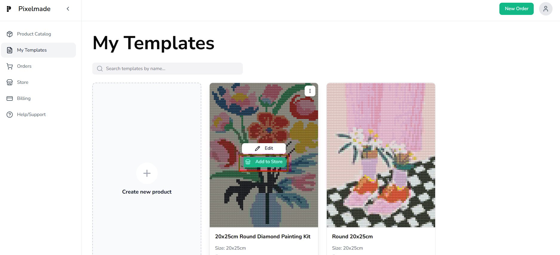 - Pick one of your created templates and click "Add to Store" to initiate the selling process.