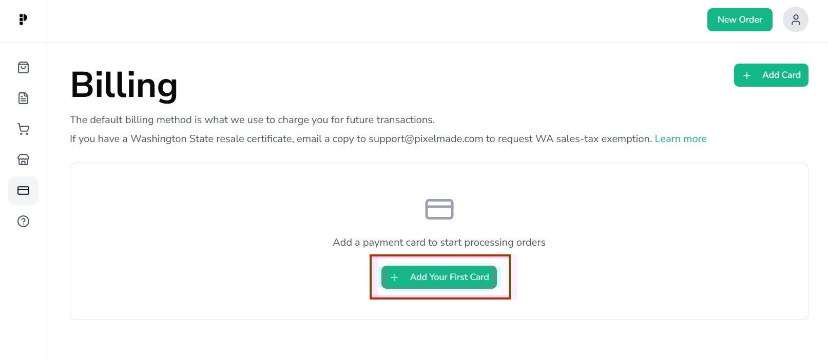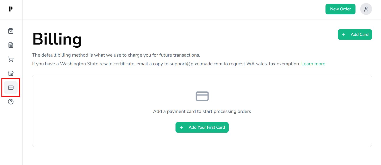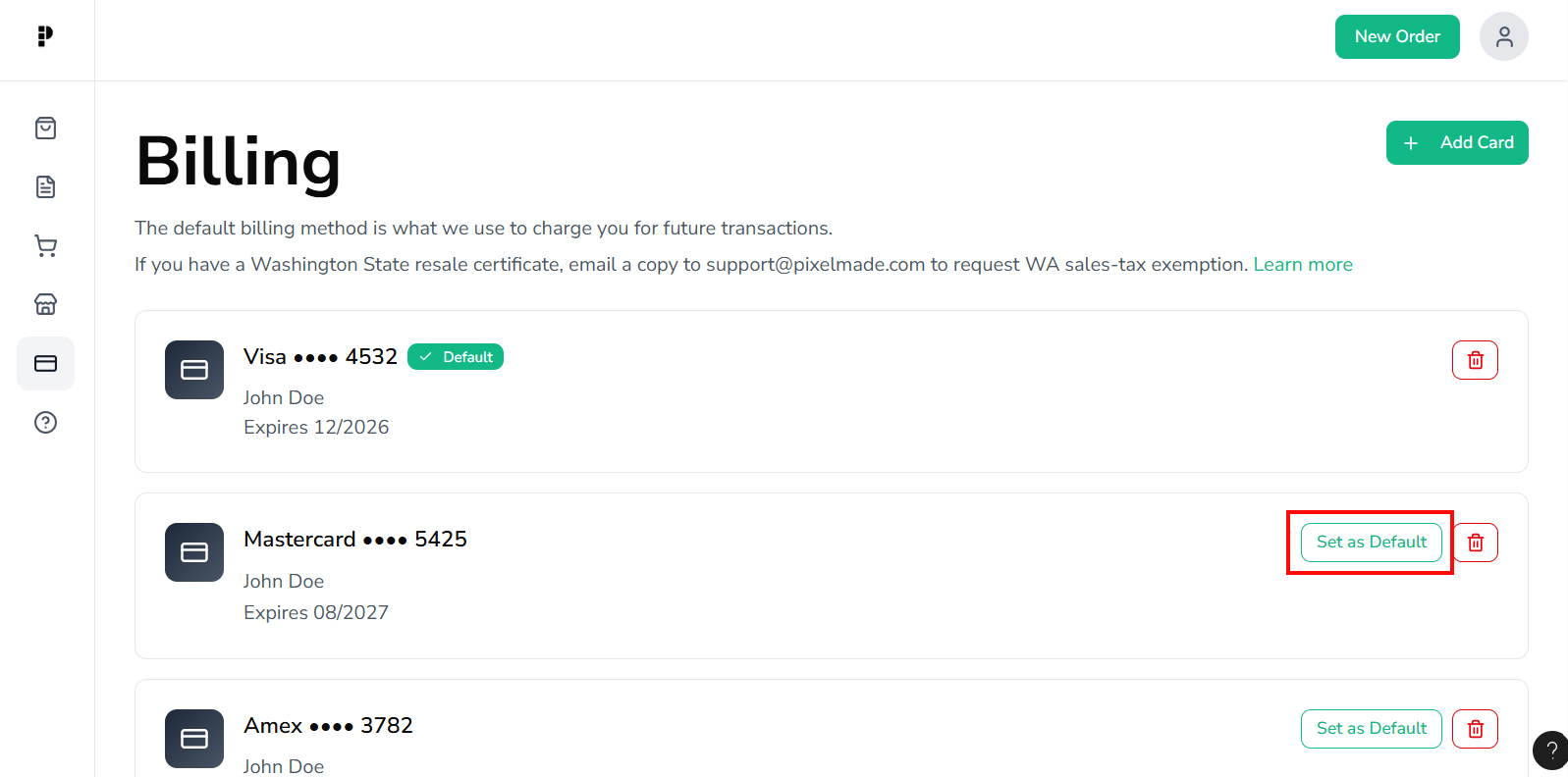 - Once you add a card, it will be set as your default payment method. You can add additional cards and change the default at any time by clicking “Set as Default” to make it the primary billing method for your orders.