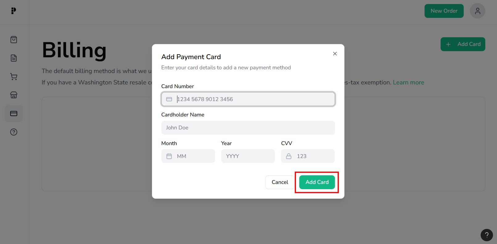 - Fill in the required information for the billing method, and click "Add Card" button.