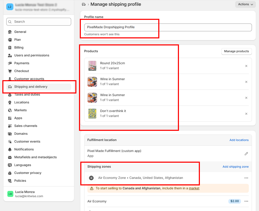 1. Each product you add to your Shopify store, will be automatically listed under the Pixelmade Shipping Profile. You will find this profile under Settings > Shipping and Delivery.