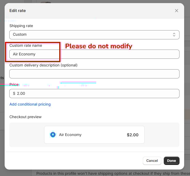- Please don't modify the custom rate name, as it may cause incorrect shipping method in the order.